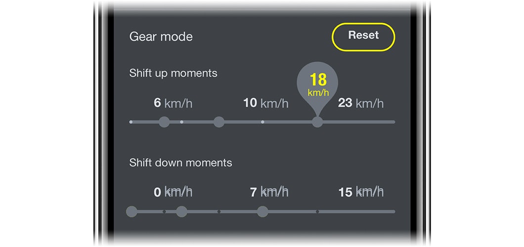 Natuurlijk kun je de E-shifter helemaal naar jouw wens aanpassen. Open simpelweg je VanMoof app, ga naar de E-shifter-instellingen, en kies daar je eigen aangepaste schakelmomenten. Moet je aan het begin van je fietsrit een hoge brug beklimmen? Stel je schakelmomenten later in, zodat je in een lage versnelling blijft als je begint met fietsen. Kan het jou niet snel genoeg? Stel dan je schakelmomenten eerder in, zodat je zo snel mogelijk je hoogste versnelling bereikt. Geen paniek als je nieuwe instellingen je niet bevallen – met één druk op de knop ga je weer terug naar de standaard-schakelmomenten.